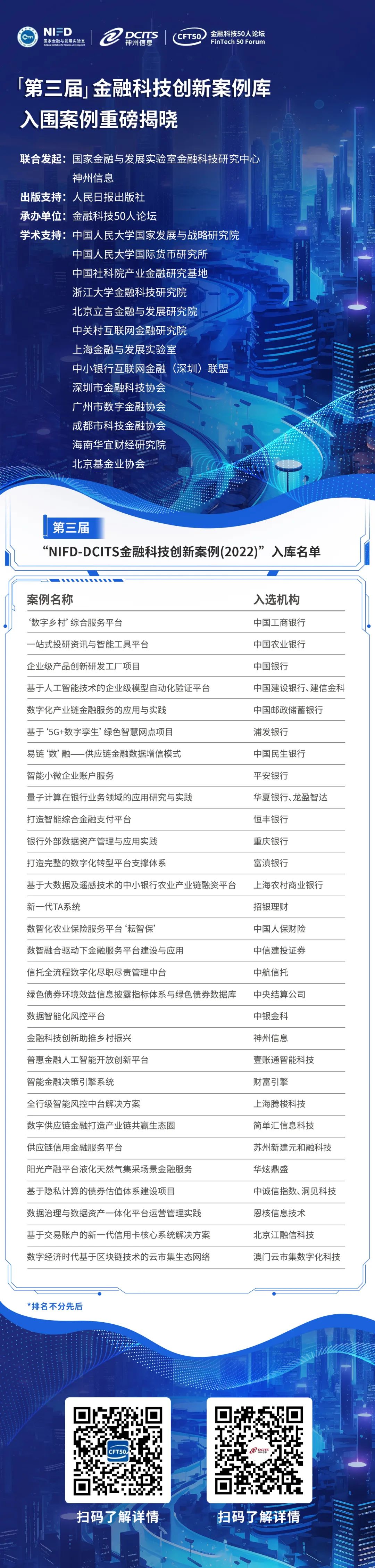 本活动由国家金融与发展实验室金融科技研究中心与神州信息共同发起,由金融科技50人论坛具体推动和落实。同时,中国人民大学国家发展与战略研究院、中国人民大学国际货币研究所、中国社科院产业金融研究基地、浙江大学金融科技研究院、北京立言金融与发展研究院、中关村互联网金融研究院、上海金融与发展实验室、中小银行互联网金融(深圳)联盟、深圳市金融科技协会、广州市数字金融协会、成都市科技金融协会、海南华宜财经研究院、北京基金业协会等单位对本次活动提供了学术支持。